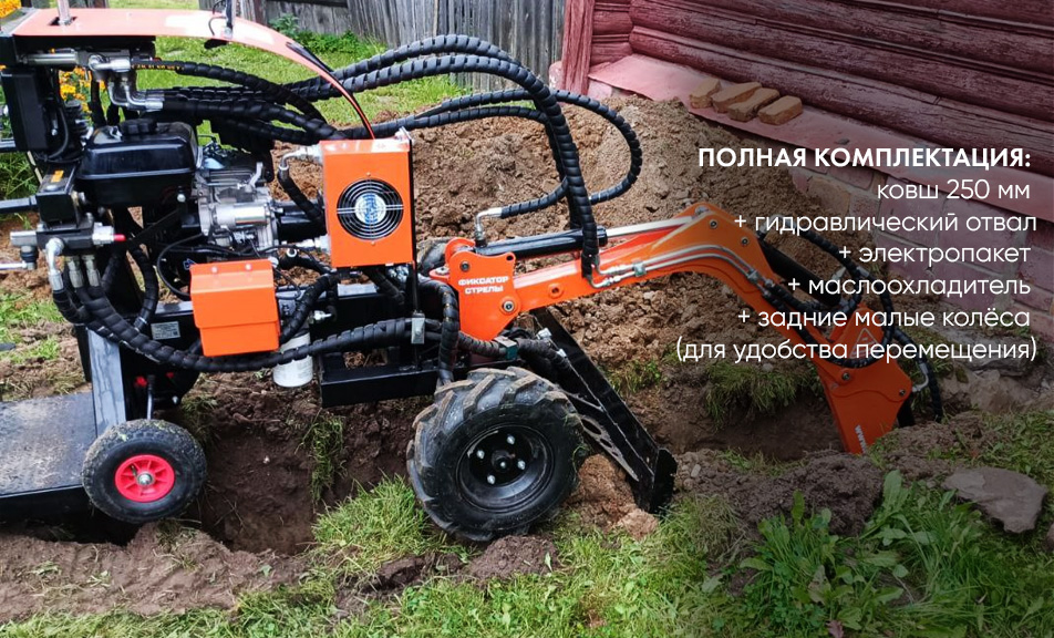 Перемещение экскаватора осуществляется (за счет гидромоторов на колесах) одним человеком аналогично мотоблоку.